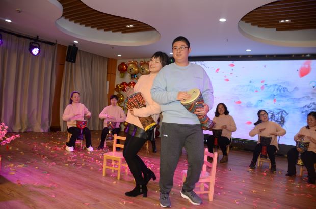 节目中间穿插的游戏《瞎子背瘸子》、《瞎子摸东西》、《抱团》、《你比划我猜》《手舞足蹈》等游戏,更是妙趣横生,热闹非凡,大家脸上都洋溢着幸福与开心!整台年会掌声不断,精彩的节目让人意犹未尽,充分展示了幼儿园全体教职工团结奋进、积极向上的精神风貌。