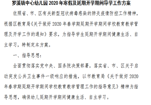 充满希望的2020年才刚刚开始,因为新型冠状病毒的入侵,同样的春节,有了不同样的假期,全民团结共同对抗疫情,每个家庭都响应号召,自我隔离,避免疫情扩散,让我们的家长和孩子有了一个难忘的春节。根据市教育局《关于做好2020年春学期延期开学期间学校教育教学管理工作的指导意见》精神为指导思想,为确保幼儿延期开学期间健康生活、自主学习,罗溪镇中心幼儿园是这样做的。