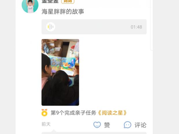 阅读的同时,表达是最好的理解方式,各班孩子开始了“讲故事大赛”,爸爸妈妈把孩子们讲故事的视频都发在了群里和平台上面,让孩子们去互相分享、互相倾听,从而互动互学,并给最好听的故事进行点赞,从而也让孩子的语言表达能力得到锻炼。