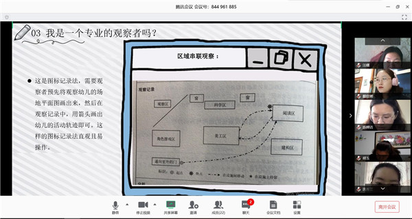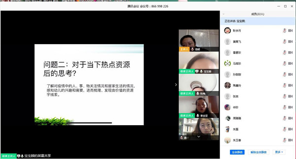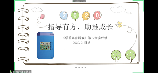 会议伊始,每个工作室由一位教师代表结合自己的阅读笔记进行了PPT汇报。《学前儿童语言核心经验》、《理想的教学点子4》、《幼儿行为观察与案例》、《学前儿童游戏》、《健康》这五本书不仅有高瞻的幼儿教学理念,还有具体的实践方法指导,汇报的老师们提纲挈领,主题明确,让大家在倾听中达成共识,形成共鸣。同时大家针对各自的工作感受结合交流问题进行了发言。虽然是第一次视频会议,但是大家的教研热情非常高,你一言我一语,用关键词、关键问题的形式有针对性地进行了交流。幼儿读写区的创设、理想教学点子的运用、当绘本遇上游戏会擦出怎样的火花,如何通过观察来支持和推进……这些聚焦的问题让大家找到了更多的方法和途径,阅读和交流也促动大家去反思。热烈的教研现场展现了龙幼教师高度的参与感和现场学习力,学习也更加有温度。