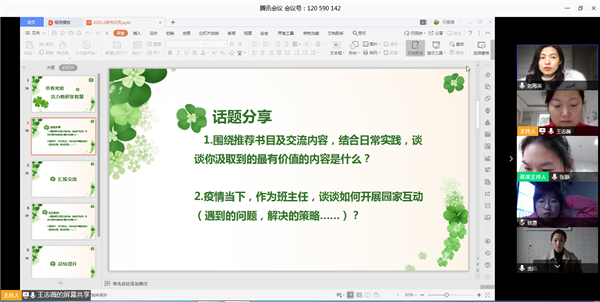 五大工作室分别组建会议房间,进行线上视频教研,这是龙幼人第一次用这种新型的会议形式开展园本培训活动。会议前,大家做了大量的准备工作,从会议方案到确定软件,从设备调试到教程推进,确保当天的线上教研万无一失。在寒假期间,每个工作室针对各自的探讨内容阅读了相应书籍,每一位老师也写下了各自的读书感悟。在今天的视频会议中,每一位工作室成员“面对面”结合实际工作经历交流了自己的收获,碰撞出了思维的火花。特殊时期的教研凭借着别样的教研形式更加入脑入心。