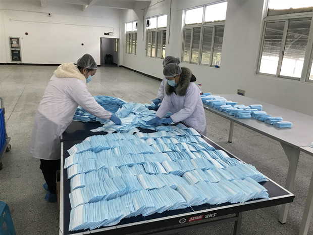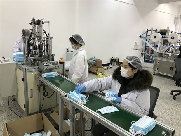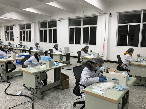 早晨八点多,全体教职员工志愿者已经提前做好个人消毒,穿戴好工作服、工作帽和口罩后进入生产车间开始了工作:口罩打片、耳带点焊、清点数量……所有志愿者分工合作,各司其职。工作时间就是生产效率,工作期间,志愿者们顾不得喝水上厕所,手脚不停地在机器前赶工。午餐和晚餐时间,大家都自觉地把餐点时间压缩在10分钟左右,餐点后更顾不上调整与休息,继续投入到口罩的生产中。晚上八点多,志愿者们依旧在挑灯夜战。一天12小时,23人每6小时轮岗一次,口罩日产量竟达到了三万六千只左右。