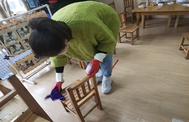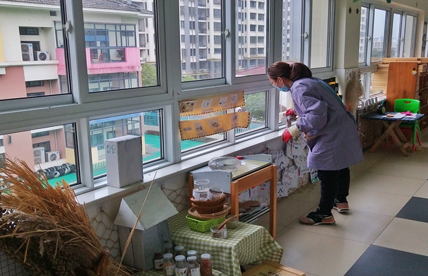戴金敏在前一天线上与后勤人员进行商量分工,并提出各项工作的要求,特别强调消毒一定要到位。早上8点,第一拨后勤人员来园,根据前期的分工忙碌起来:扫的扫、抹的抹、擦的擦、洗的洗、冲的冲,拖的拖,一道道工序井然有序。经过后勤人员将近3个小时的齐心合力,分工合作,整个幼儿园彻底“洗了个澡”,让由于新冠肺炎疫情沉寂了近2个月的幼儿园焕然一新,呈现出整洁清新的新气象。