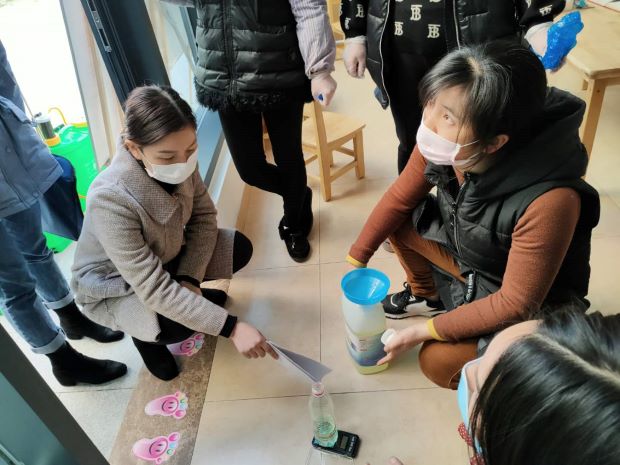 为深入贯彻落实省、市、及区教育局要求,切实做好新冠防疫工作,3月11日下午16时,常州市新北区魏村卫生院的防疫人员来到孝都幼儿园对幼儿园疫情防控消毒工作做了相应的指导,防疫站的工作人员细心的和老师们交代了不同品牌“84消毒液”不同配比换算的方法,消毒泡腾片的具体使用途径等,还热情的观看了保健老师张秀峰的七步洗手法,并提当场提出了表扬。在查看防疫台账的过程中连连称赞孝都幼儿园的教师细心细致,想的很周全,也做的较全面。