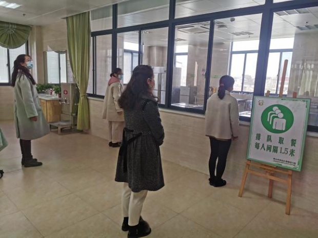 此次实战演练,首先模拟幼儿入园晨检,幼儿在间距1.5米的安全距离有序排队,检测体温,查看体征,符合要求方可入园。其次还模拟在幼儿园一日活动期间,带班教师在检查中发现幼儿体温异常等状况,立即联系幼儿家长并上报园部。园部应急处置小组马上启动应急预案,并及时进行上报、隔离、消毒等应急处置工作。另外,我们就教职工错时分开用餐进行了模拟演练,使教师清楚了解进餐厅的用餐的要点和流程。