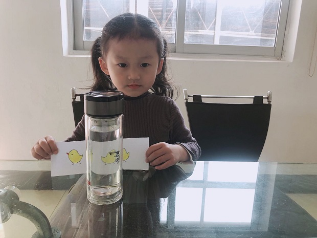 我们把透明玻璃杯倒一杯清水,把画有小鸡的图片放在杯子后面,轻轻挪动。神奇的事情就发生啦,透过杯子看到小鸡转了身,改变了行进的方向!