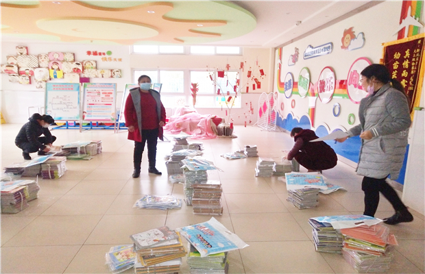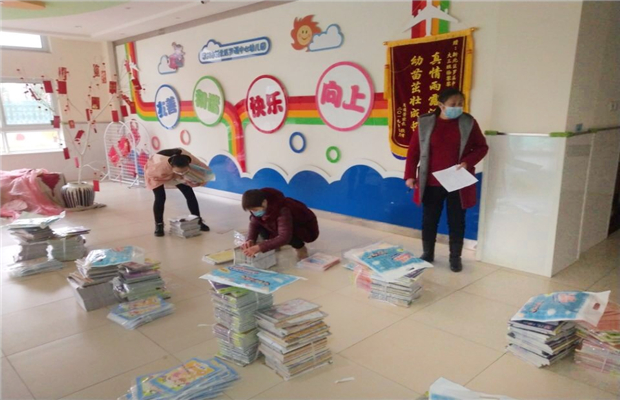 我园后勤主任戴金敏提前一天线上与后勤人员召开会议,让各个部门进一步明晰新学期各自的分工与职责,特别是疫情还未完全得到解除,卫生、消毒工作不能掉以轻心,并提醒后勤人员来园必须做好个人防护措施。3月19日上午8:30后勤人员来园后,在戴金敏的组织下,先将全园600多份幼儿用书、教师用书按照预先统计的各班人数进行分类;然后由各班保育员核对数量,将用书搬回自己班级整理摆放;最后各部门分工对环境进行卫生清洁与消毒。