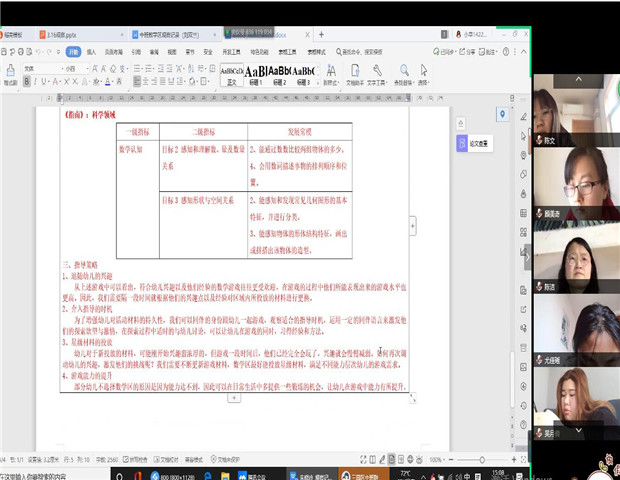 观察既是教师应具备的重要能力,也是把握幼儿已有经验、了解幼儿发展状况的基本途径。活动伊始,小中大三个级组四个会议室一起观看了园部提供的日常活动视频——“幼儿户外混龄体育游戏”,自行设计表格并进行现场记录和分析。云现场,教师们围绕“观察目标、观察方法、跟进支持” 等重点交流自己的观察记录,在交流中教师们集思广益,不断碰撞出智慧的火花,让老师们再次明晰,要做好观察记录必须做到:认真确立观察目的,选择合适的观察记录方法,选择合适的观察角度,获取梳理有效的信息,调整优化后续的行为进行跟进支持。