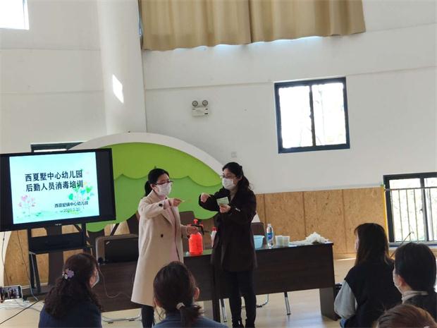 为全力做好疫情后期开学筹备工作,有效阻断病毒传播途径,增强疫情防控处置能力,3月20下午,西夏墅幼儿园对全体后勤人员进行了一次卫生消毒知识实操练习培训。