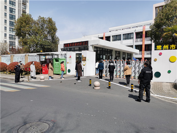 校门外左右两边分别设置了两队“小黄点”,每两个小黄点之间间隔1.5米。开学时,中大班孩子们分流分批分队定点站位,逐个入园。