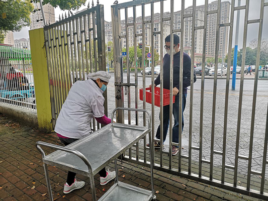 供应商送货人配送单位送餐员每次进入学校时门口测量体温。学校接货员在采购、运输、验收工作中均需佩戴口罩和一次性手套,交接时尽量避免近距离接触,专车专用,净菜、半成品等特殊食材需专用推车配送,每次运输食品前进行清洗消毒。