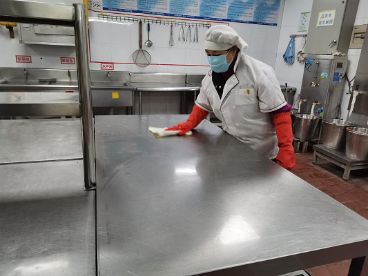 对食堂内外环境、地面、餐桌椅每天进行全面消毒,如使用1:100比例配置“84”消毒液进行喷洒、擦拭消毒。