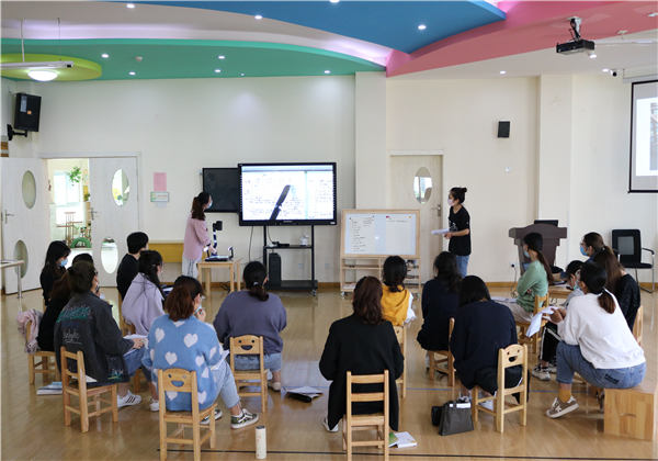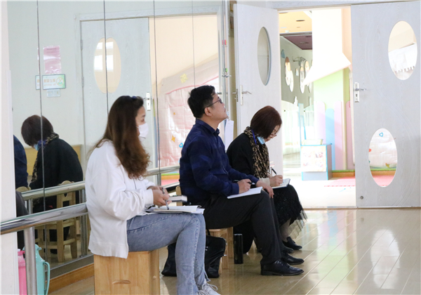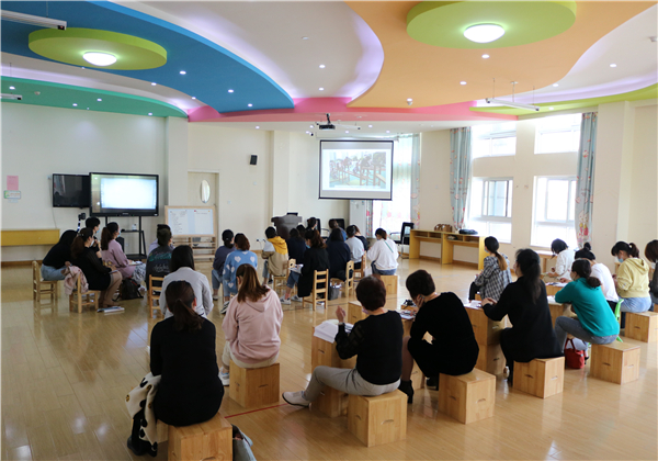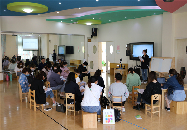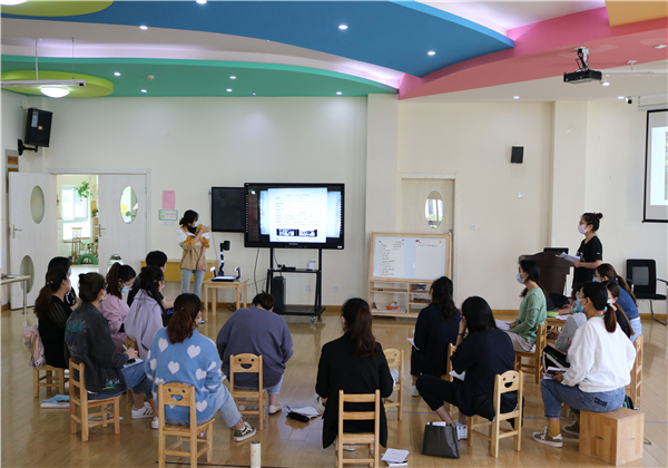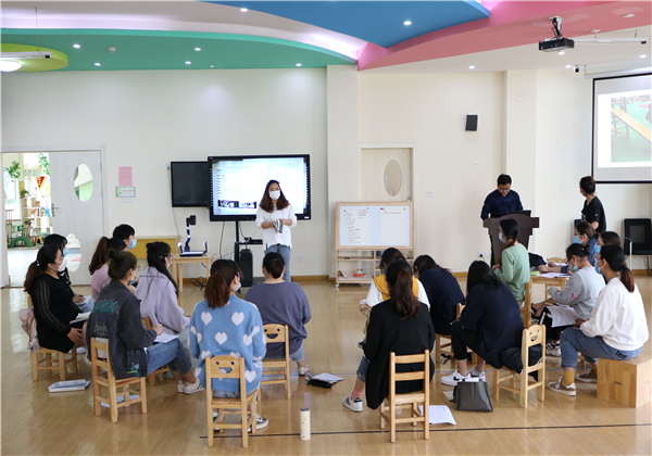 在丁子怡老师的主持下,会议从案例剖析、观察实操、总结提升这三方面展开。首先针对一篇观察记录寻找可借鉴或优化之处,老师们发表了自己的所思、所想、所感,徐老师对于大家的想法给予了肯定,对于大家的疑惑给出了解决的策略;接着,根据一段视频进行观察,要求老师们设计表格进行现场记录,30分钟后小、中、大年级组各派一名代表分享了自己的观察记录,由年级组长进行了点评。