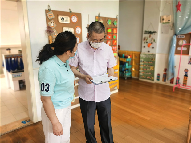 5月18日,是河海街道中心幼儿园大班开学第一天。为了保证幼儿入园环境的安全、科学、规范,新北区教育局黄厚才很早来到幼儿园,并对幼儿入园、生活学习以及食堂、防疫情况再次排查。