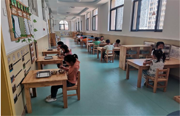 精心组织生活活动。午餐、点心、午睡,我们用“一米”距离保护幼儿的卫生安全。大班幼儿表现出较强的自主能力。