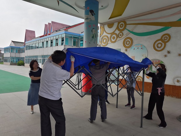 5月11日下午,全园教职工都及时到岗开始了工作。室外环境、班级环境、幼儿入园等待区、行进路线、晨检点、隔离区等户外区域大环境的布置全部到位。遮阳棚、交通隔离带、塑料栅栏、临时隔离室等的准备工作都在大家的齐心协力下逐渐完善。