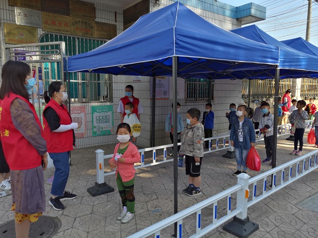 5月18日,是新学期开学的日子,新北区教研室陈建伟校长、新北区安家派出所民警和协警、安家幼儿园行政领导和教师志愿者全部提前到岗,等待孩子们的到来。8点前,大一班和大二班的孩子根据错峰时间陆续来园,在教师志愿者的引导下,幼儿在规定区域内一米距离排队等候、依次接受红外线体温检测正常后进入园内,入园后再接受一系列的检查,最后进入班级。生活用品根据幼儿需求由志愿者帮忙运送,而家长则遵循快送及走的原则,很好地避免了校门口拥堵的问题。