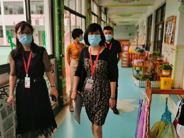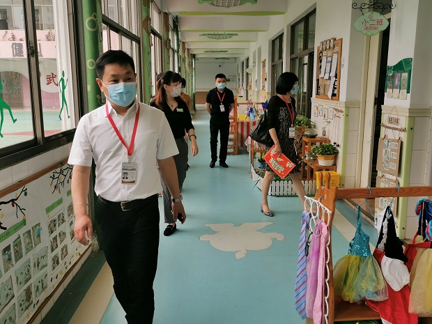 在殷藜芬园长的带领下,姜镇长一行参观了园所环境,并详细了解了师幼的工作、学习、生活及幼儿园基础设施配置、校园文化等相关情况。同时,对园所复学工作到位,措施得力,校园美丽整洁等给予充分肯定。