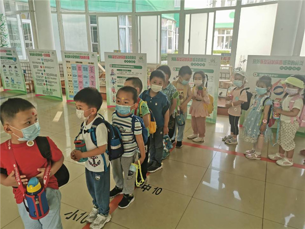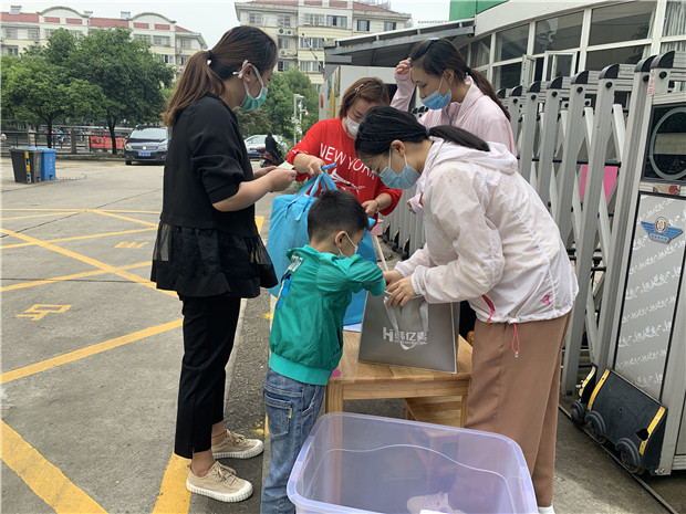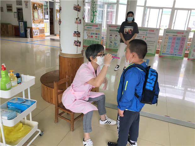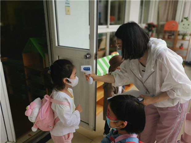 为了保障每一个宝贝的安全健康,老师们提前一天接收幼儿的床上用品、生活用品等。开学当天实行错峰入园,家长带幼儿在黄点等候,中班幼儿通过校门口的红外线测温、晨检等环节后独自有序进入幼儿园,小班幼儿独自进入幼儿园大厅后由本班保育老师带到教室。本班老师再进行二次测温、放好物品后方可进入班级。