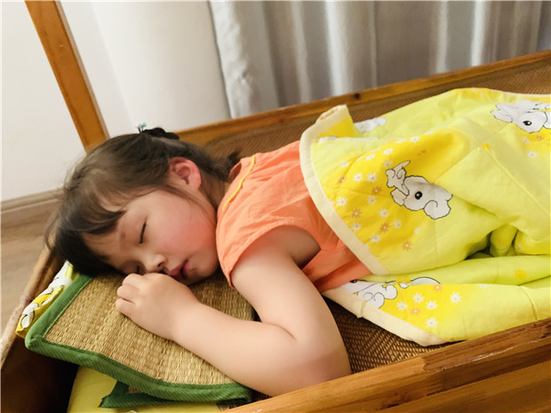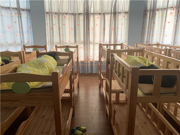 午餐时间到,每张桌子两名幼儿用餐,保证幼儿用餐时的安全距离。午睡环节同样井然有序,睡前测温,床铺距离调整,老师们随时关注孩子身体状况。
