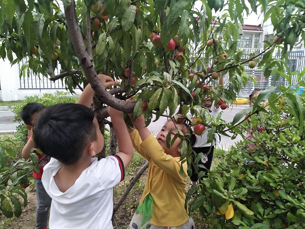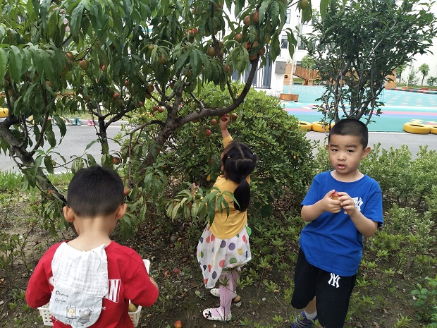 轩轩说:在采的时候要观察桃子的颜色,还要捏一捏桃子,看到颜色是红的,捏起来是软的桃子才可以摘。
