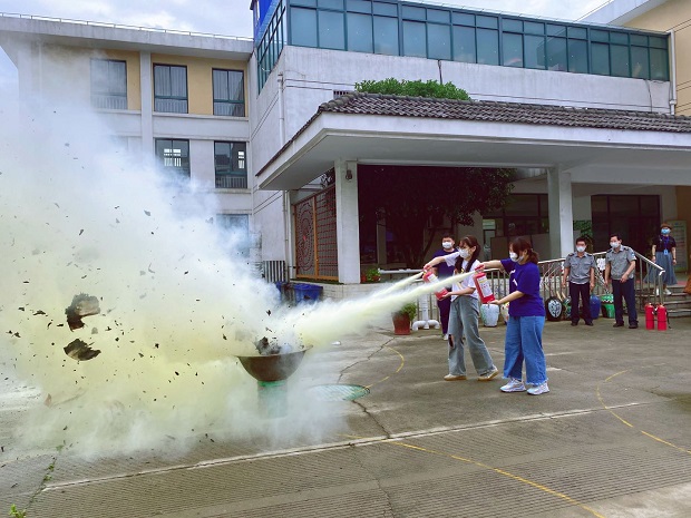 伴随着紧急警报声响起,演练开始。操场上冒起阵阵“浓烟”,参培教师在消防中队邹队长的指挥下,弯着腰,用毛巾捂住口鼻迅速有序地撤离到安全区域集合。随后,邹队长对本次演练进行了点评,并手把手教授灭火器、消防栓等扑灭初期火灾“利器”的使用方法,大家重新温习了灭火器灭火技能。
