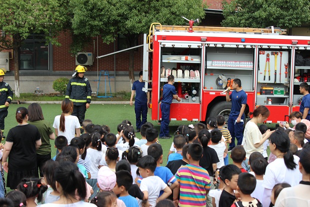 同时,立足自身实际开展了消防演练,在演习前,各班老师对幼儿进行了消防安全知识的讲解,让幼儿了解基本的逃生技能。随着警报的响起,演练活动开始了,所有幼儿弯着腰,拿湿毛巾捂着口鼻,每个孩子都非常投入,全园师生有序快速撤离班级集中到安全指定地点。逃生演练活动结束后,消防车进入幼儿园,消防员叔叔给全园师生进行了火场逃生知识讲解,并现场演示了灭火器的使用方法,大家再通过亲手操作,将理论转化为实践,真正地掌握消灭初期火灾的方法和能力。有效增强了全园师生的消防安全意识,提高了幼儿园处置火灾突发事件、组织幼儿迅速安全疏散的应变能力,进一步落实了安全教育。