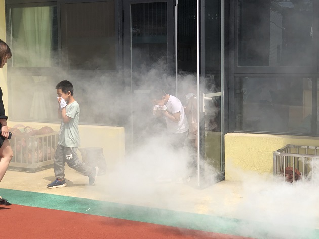 随着警报声响起,消防演练活动正式开始。幼儿在教师们的带领下,沿安全通道路线紧急疏散,离开教室撤离到安全地点,幼儿到达指定的安全位置后,各班老师迅速清点人数并上报。本次活动,从警报拉响到全体师幼安全到达规定的地方,只用了3分15秒,演练取得了圆满的成功。