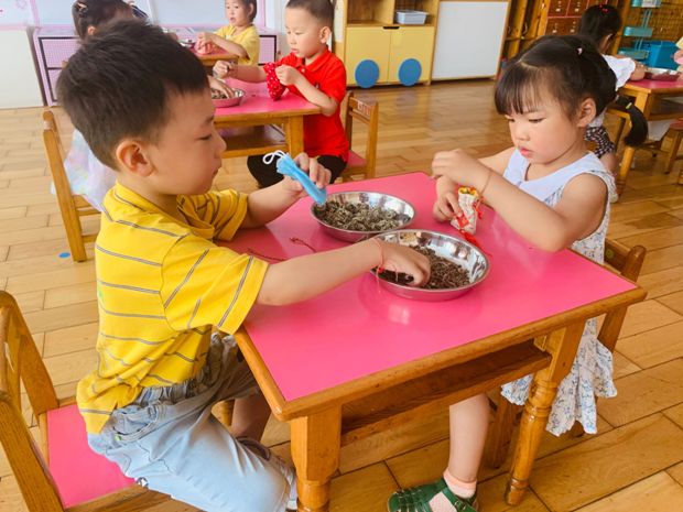 大班孩子通过话说端午、做香包、绘龙舟、腌咸蛋、包粽子、画钟馗、编五毒绳等活动走进端午、表现端午;中班以蛋为载体开展了端午节的活动,孩子们在护蛋、斗蛋、腌咸蛋、绘制五彩蛋系列活动中了解端午、体味端午;小班孩子在亲子编五彩绳、亲子做香包、挂艾叶、划龙舟比赛、认识粽子、粽子想象画等活动中感知端午、品味端午。小、中、大三个年段孩子在表达体验中了解端午节的来历、民间习俗,感受端午节的文化内涵,亲身体验传统节日带来的乐趣,体会我国传统佳节的独特魅力。