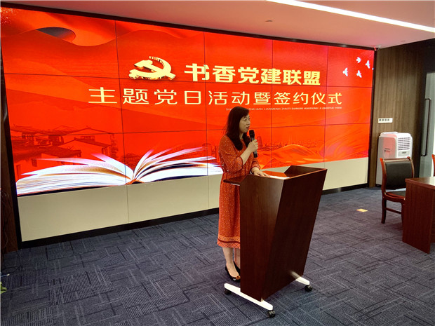 常州市图书馆支部书记钱竑向大家介绍了常州市图书馆新馆为党建活动所创造的平台和条件,回顾了联盟正式成立一年以来,各单位书香党建的开展情况,并就各自党建特色和党建优势进行了分享。她表示,希望通过制度化的交流和合作,实现互相借鉴、优势互补的共建目标。最后,在活动主持人的带领下,我们一起参观了常州图书馆新馆,一起向往美好,浸润书“香”。
