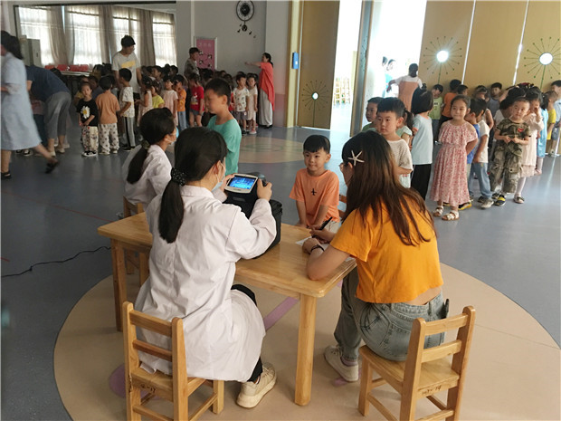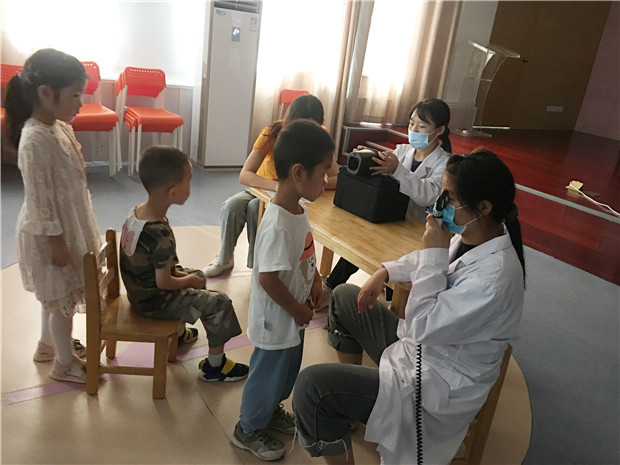 检查开始了,孩子们井然有序地排队等候检查,医生们使用先进的视力测查仪器,科学的测试手段,根据幼儿的年龄特点、视力发展水平,认真、细致地为幼儿检查视力。