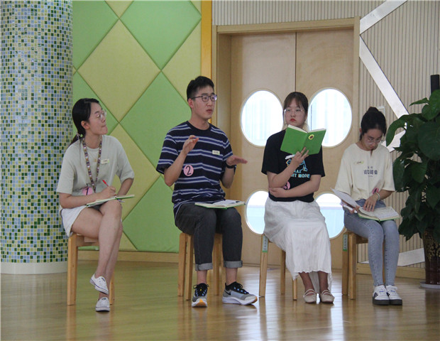 经过前期课堂教学、成长档案两项的评比,7月9日,新教师们进入第三板块现场教研。活动还特邀牵手单位滨江豪园赵晓丽园长以及龙幼责任督学暨宋庆龄幼儿园胡静园长参与观摩,并承担优秀师徒评选暨责任督学督查工作。活动中,首先由第一轮教学展示中有突出表现的蒋丹昀和周雁南老师进行现场执教,他们分两个会场,分别为大家带来了中班健康《我们身体里的洞》、大班语言《摇摇晃晃的桥》。在精彩的教学展示结束后,新教师们围绕互动话题,结合教学过程中的具体情况,畅谈执教者在课堂中的落实。在无组织教研的过程中,新教师们都能大胆发声,畅所欲言。教研现场有理有据,有对执教老师教学亮点的赞扬,有对绘本价值与资源运用的剖析,有对倾听回应细节处理的建议……大家在智慧碰撞下,对于课堂教学以及“绘本游戏化”有了新的认识和提升。