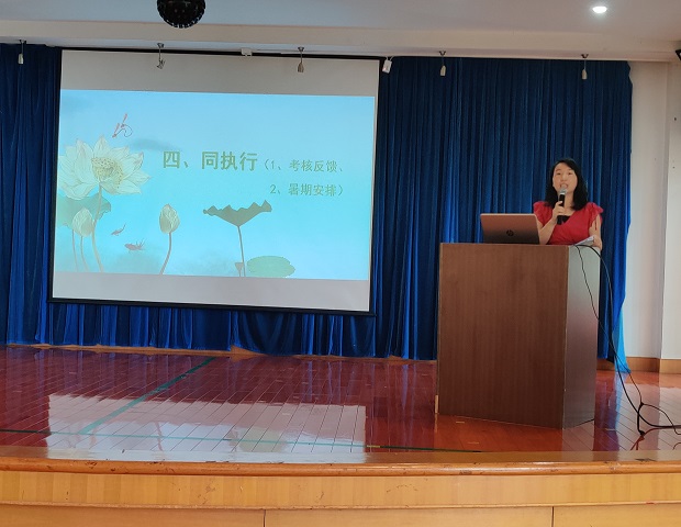 李老师对本学期的期末考核进行反馈,在肯定所取得成绩的同时指出部分工作中存在的问题与不足,并提出今后改进的建议与意见。同时眭园长还分别对暑期班人员安排、新生报名、暑期安全及暑期教师学习与培训等后期工作进行了详细的部署,并且提醒要时刻做好疫情防控。