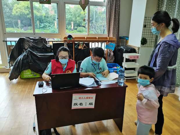 结合常态化疫情防控,报名处分别设置在五个不同的班级。每个报名等候处都有党员教师站岗,接受家长咨询,核对资料准备是否齐全,并协助新生家长将资料按顺序放好。