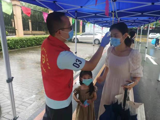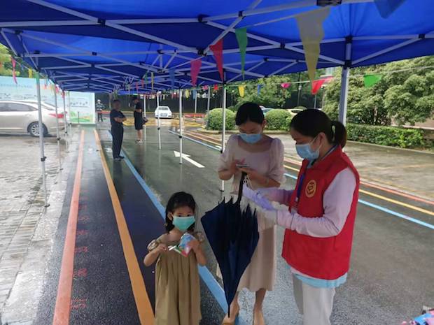 全体党员教师穿上红马甲,亮出身份,活跃在新生报名服务工作各个环节。校门口,党员教师引导新生家长戴好口罩,出示健康码,测量体温,凭预约单领取报名号分批入园。