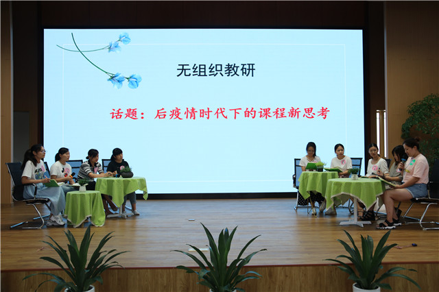 随后,包含一线教师代表、年级组长及家长代表的9人组开展了以“后疫情时代下的课程新思考”为话题的无组织教研。教研现场流淌着教师们对于“后疫情时代”、“课程新思考”方面的观点阐述:有从自身班级出发,探讨后疫情当下需要关注的课程要点;有从案例思考,发表对课程实施过程中自己的感叹;还有引经据典,对课程核心价值的侃侃而谈……30分钟时间悄然而去,思维场域中大家畅所欲言了自己在后疫情时代下对课程开发、实施及评价的深入理解,让在场聆听的众多教师时不时送上热烈的掌声。
