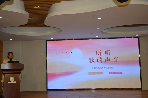 残云收夏暑,新雨带秋岚。告别了丰富多彩的暑假生活,我们又迎来了忙碌的金秋。2020年8月24日下午,孝都幼儿园召开了新学期期初工作会议,全体教职工以昂扬的精神面貌、饱满的工作热情参加了会议,迎接新学期的到来。本次会议由徐倩老师主持,一共分为五个篇章。