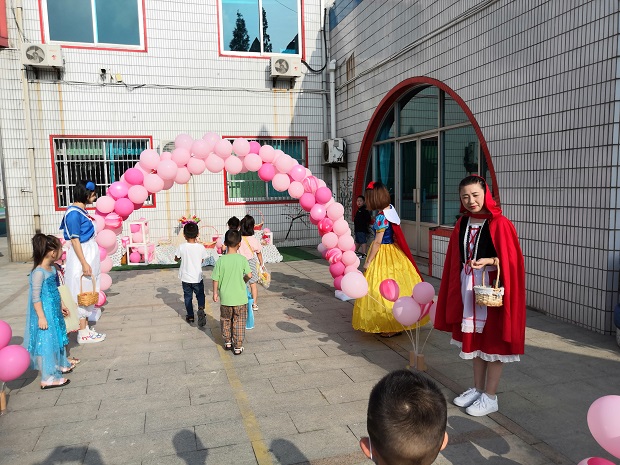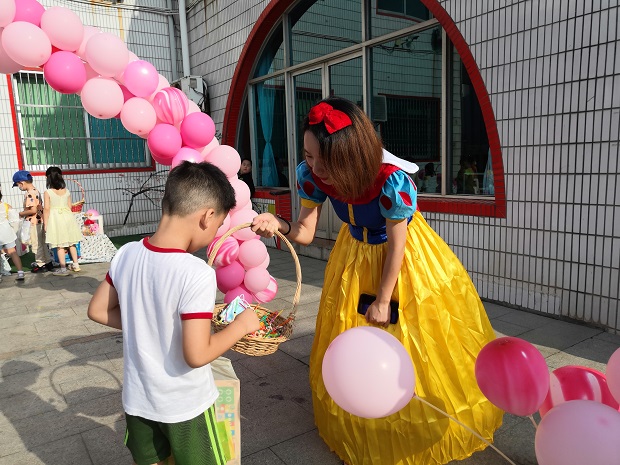 一大早,安家幼儿园以崭新的环境面貌迎接孩子们的到来。因疫情防控的需要,只有一条进园通道,教师们就充分利用这个通道,精心布置了开学迎新的环境。沿路是色彩鲜艳的彩球,还有一个超级大的彩球拱形门,将孩子们的注意力一下子集中起来,大厅内放置着镂空小猪佩琪、机器猫等卡通形象,供小朋友第一天入园拍照留念。最吸引孩子们注意力、最夺人眼球的莫过于师生穿着扮演好的卡通人物形象:冰雪女王、白雪公主、小红帽、爱莎公主等,这些卡通人物为入园的小朋友分发礼物,安抚新生情绪。园内还为小朋友准备了可以自主选择礼物、零食的区域,供中大班小朋友签名的签名墙,他们在向世界宣告:我长大了!一系列的环境,让小朋友们缓解了离开家庭的焦虑情绪,被新奇的幼儿园生活吸引。而最大的创新在于:所有家长一律没有进园,包括小班新生家长。孩子自己入园,测量体温,跟随班级老师走进教室。在一系列迎新方式的影响下,一些新生止住了哭声,睁大了新奇的双眼,重新去打量这个自己即将开始学习和生活的幼儿园,因此改变了心情,从不愿意到愿意上幼儿园,跨出了最勇敢的一步。而新生家长,也从焦躁不安中慢慢地趋向平静。