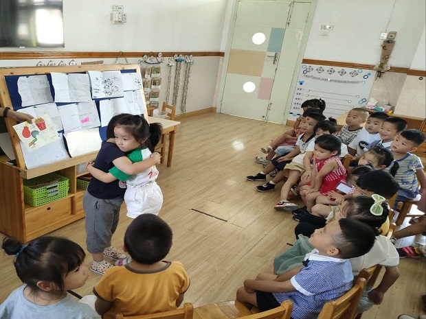 小班的小朋友到了一个新的环境难免有些陌生,老师热情地接待他们,让他们在听听、玩玩、看看、尝尝等有趣的活动中,认识自己的班级、老师,并尝试在大家面前说出自己的名字。老师还带领幼儿参观了幼儿园,感受幼儿园的美,熟悉幼儿园的环境。中大班的孩子在久别了多日之后,见到自己的同伴和老师,大家相聚在一起,兴致勃勃地分享着自己的暑期生活,帮助老师和小朋友做力所能及的事……