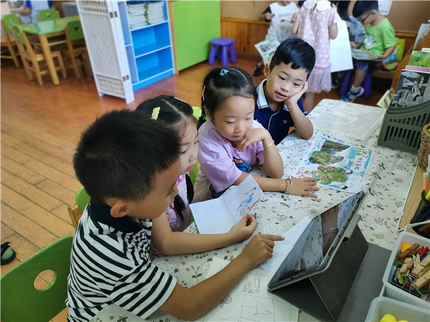 最激动人心的要数班级暑假趣事的交流了,为了让孩子的交流更有氛围,老师们提前布置教室,铺上温馨的桌布,放一份清新的绿植,为了让孩子们的交流更有趣味,家长们给孩子准备了平板、手机、自制书籍、旅游纪念品、照片、旅游景点图等等。就这样一切准备就绪,找个喜欢的地方,拉上自己的好朋友,三个一群,五个一组,教室里顿时热闹开了!有的点开妈妈制作的暑假趣事的视频,兴奋地跟大家介绍着,有的带着旅游景点买的纪念品,边演示边介绍。咦,这里在干什么?原来是被妈妈自制的趣事书籍给吸引住啦!许久不见的孩子们见面了,开始还带着一份羞涩,但在这场交流中,孩子们彼此打开心扉开始畅聊!