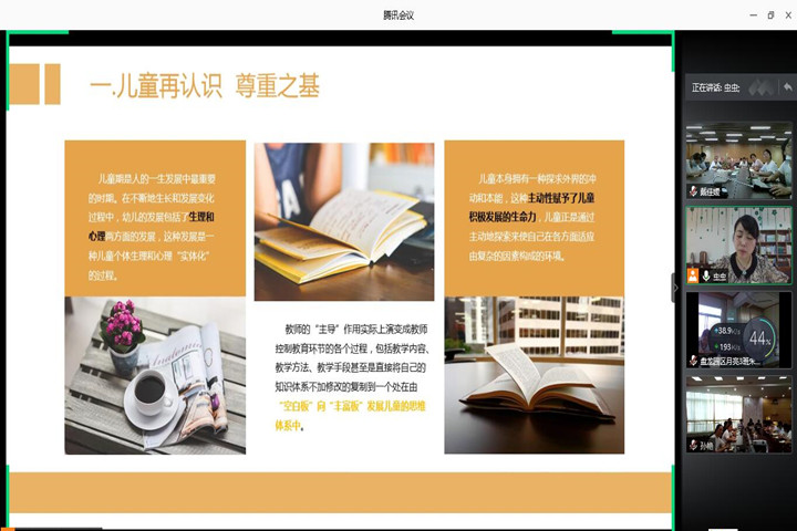 下午四点半,四园区的保育员们在各自园区相遇云端,一起交流分享。在会议前大家提前对暑期共读的《童年的秘密》一书写下了读书感悟。在视频会议中,万叶云、董白花、蒋和贤、任洁4位保育员分别向大家分享了自己的读书收获。她们将书中蒙台梭利详细而生动描绘的儿童生理和心理特征对接到实际工作经历中去,尝试解析幼儿行为背后所想表达的想法。王彩红副主任和孙艳副主任也纷纷分享了自己的读书感悟,从儿童再认识,到学会等待与引导,希望保育员们要通过观察来走近幼儿的心灵,释放幼儿的个性。