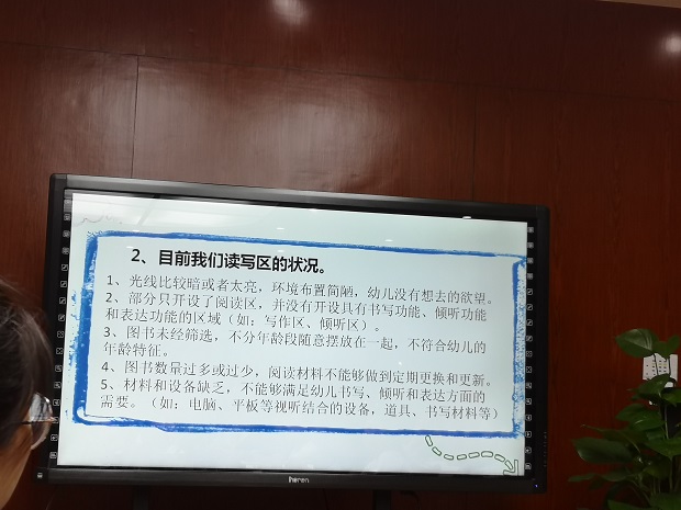 经过一个暑假的读书分享,这学期本园阅读区的重点放在了“如何创设适宜的读写区”上,针对这一目标,包老师先结合前期线上教研内容总结了我们的读写区现状,中二班的鲍老师也结合开学一周以来班级读写区的实施情况,进行了分享并提出了她的疑惑。借由问题包老师从“读写区环创原则”以及“其他幼儿园各年龄段阅读区创设计划表”两方面进行了深入分享,老师们学习了如何从“材料投放”、“教师策略”以及“理论依据”三方面来设计评估阅读区中孩子的游戏。最后包老师展示了一些阅读区以及读写区的环创图片,为老师们创设孩子感兴趣的区域开拓了思路。