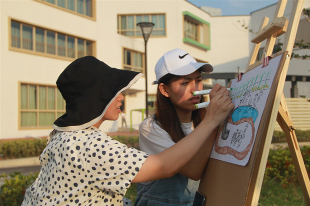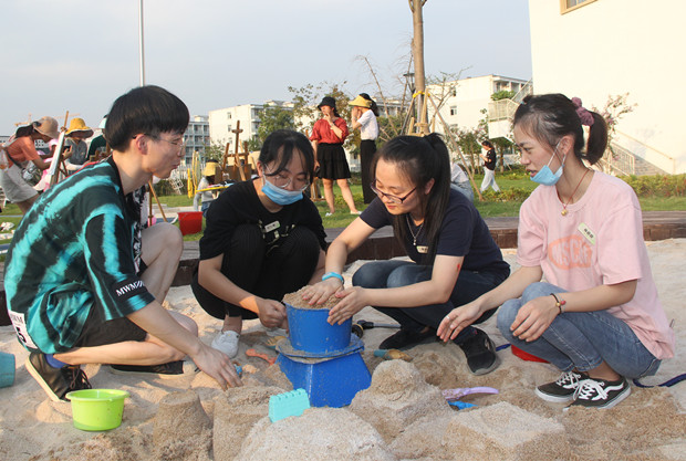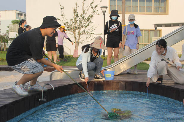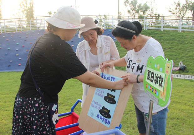 本次游戏体验分为两大区域八大体验区。当主持人一声令响,老师们飞奔而去,或三五成群,或以年级组为单位,自由选择,自主体验。沙水区域,有的老师捕捉校园美景进行户外写生,持笔在纸上自由挥洒,一同经历一场别样的趣墨邂逅。有的老师围绕在小池塘边,手持渔网奋力捞鱼。抓到的兴奋叫喊着,没有抓到的互相讨教经验,欢笑声弥漫着整个操场。还有的老师在沙池中利用丰富的材料合力探索沙水新玩法,亲近自然,释放自我。角色区域为大家提供了多种低结构材料,教师根据需求,进行相关区域的道具制作及角色游戏体验:“理发店”里,每位老师都是Tony,每位“顾客”都是最靓的仔;“阳光花店”里,每一个人尽享DIY花饰的独一无二和其乐无穷;“夏日冰饮店”里,老师们或动手制作宣传海报或亲手制作美味冰激凌,成就感和快乐感席卷初秋的傍晚……