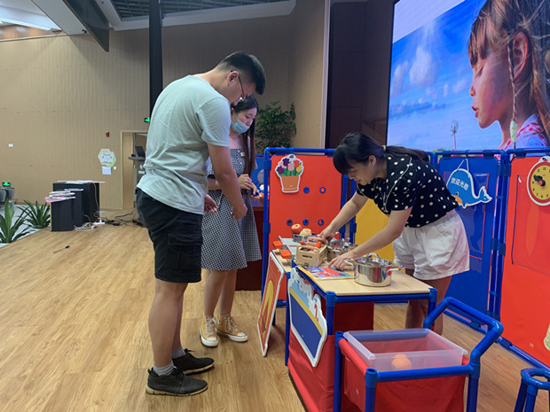 培训师从为什么开展户外游戏,游戏开展前的各项安排和游戏组织流程三个版块进行了阐述,强调户外游戏要让幼儿的主题更多元,建构更自主,思维更发散,社交范围大。同时,培训师结合户外角色区的器材,介绍了开发理念,逐一示范了器材的使用方法。