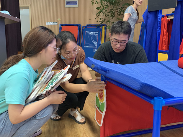 紧接着,培训师邀请现场教师进行实战演练。4名教师组成一组,总共两组,每组确定一个主题,大家一起操作探索。在体验中,每位老师都变成了天真的幼儿,认真地操作,感受其中的乐趣。最后,由各组老师代表向大家介绍自己组互动材料的玩法。在游戏中老师们对户外角色游戏材料的使用更为清晰明了。