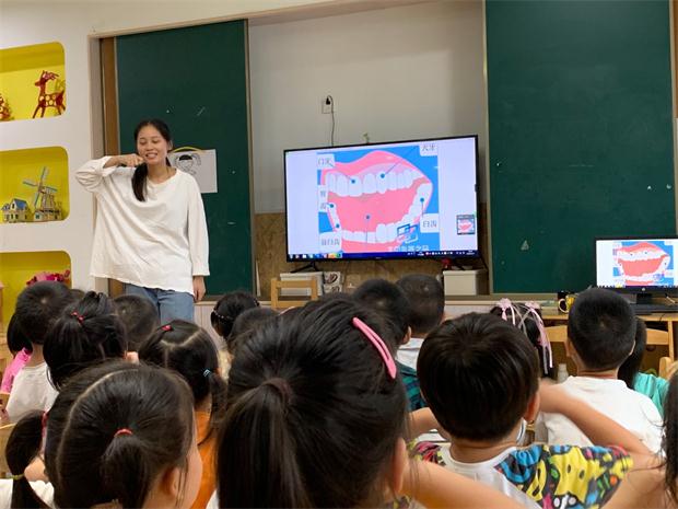 活动中,结合形象的视频与图片,向幼儿详细地讲解牙齿的结构、作用,介绍爱护牙齿的重要性以及如何保护牙齿的方法。孩子们跟着欢快的音乐节奏,手拿小牙刷,在老师的带领下,体验刷牙的乐趣,掌握正确的刷牙方法,让小朋友们懂得爱护牙齿,要从小做起,要养成每天早晚刷牙、饭后漱口,临睡前不吃零食、要多吃水果蔬菜、五谷杂粮,少吃甜食、零食等牙齿保健常识。