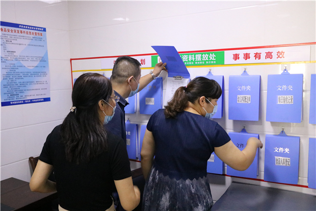 接着,在谢菊仙园长的带领下,检查组一行实地查看保健室、食堂,详细了解食堂的食物留样、餐具消毒、菜品进出库登记等情况,在对幼儿园整体情况给予高度认可的同时也提出了建设性意见。