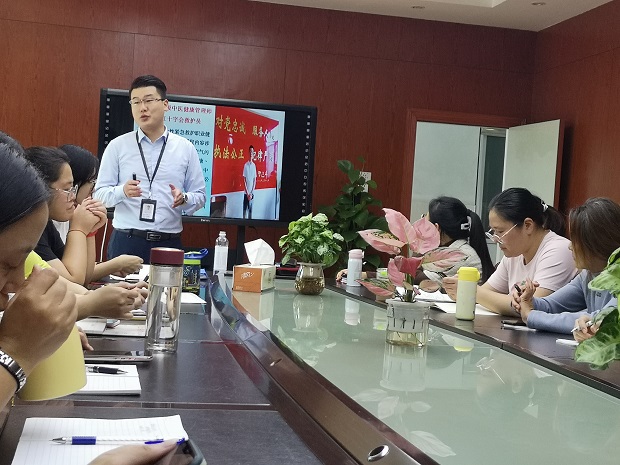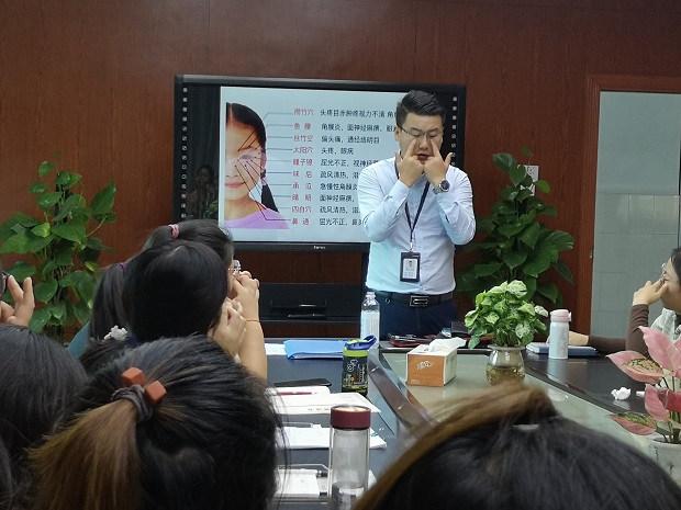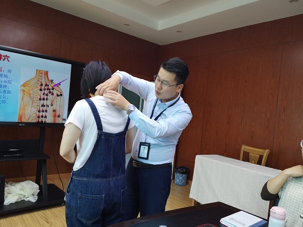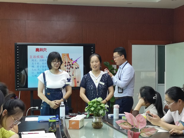潘主任首先就从现代人的普遍亚健康状态入手,讲解了致病致死率最高的几大疾病是如何形成的以及如何预防。接下来就针对教师这一职业所拥有的三大职业病——肩周炎、颈椎病以及腰椎间盘突出提出了行之有效的建议,潘主任从中医学的角度出发,建议老师们可以利用针灸理疗的方法治疗已存在的病痛,还给老师们亲身示范了几大重要穴位,邀请了有颈椎病困扰的老师进行理疗一起体验,帮助缓解伤痛。