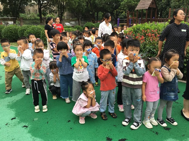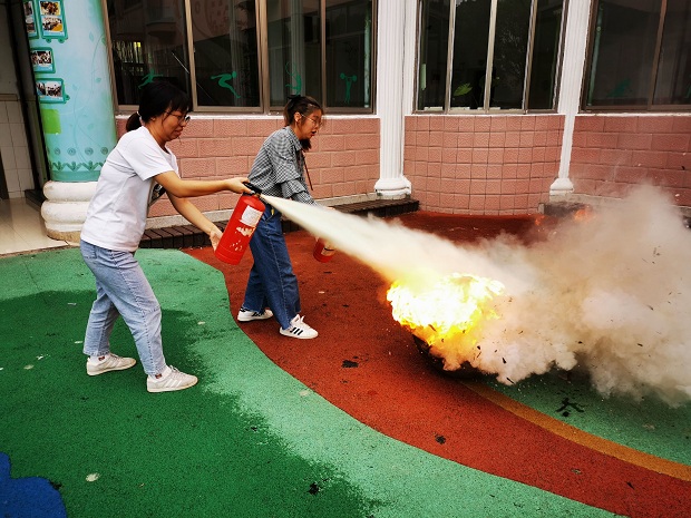 演练前,教师对幼儿进行了防火和应急逃生教育。随着火灾警报声的响起,演练开始,各班幼儿在班级老师的带领下,迅速拿起湿毛巾,捂住口鼻,低身前进,井然有序地按照消防逃生路线安全疏散,无拥挤情况发生,无幼儿遗漏,在短时间内全部撤离到了空旷的操场上。随后,两位老师现场演示了如何灭火,殷美玉园长对全体幼儿进行了互动式消防知识问答,对演练活动进行了总结点评。