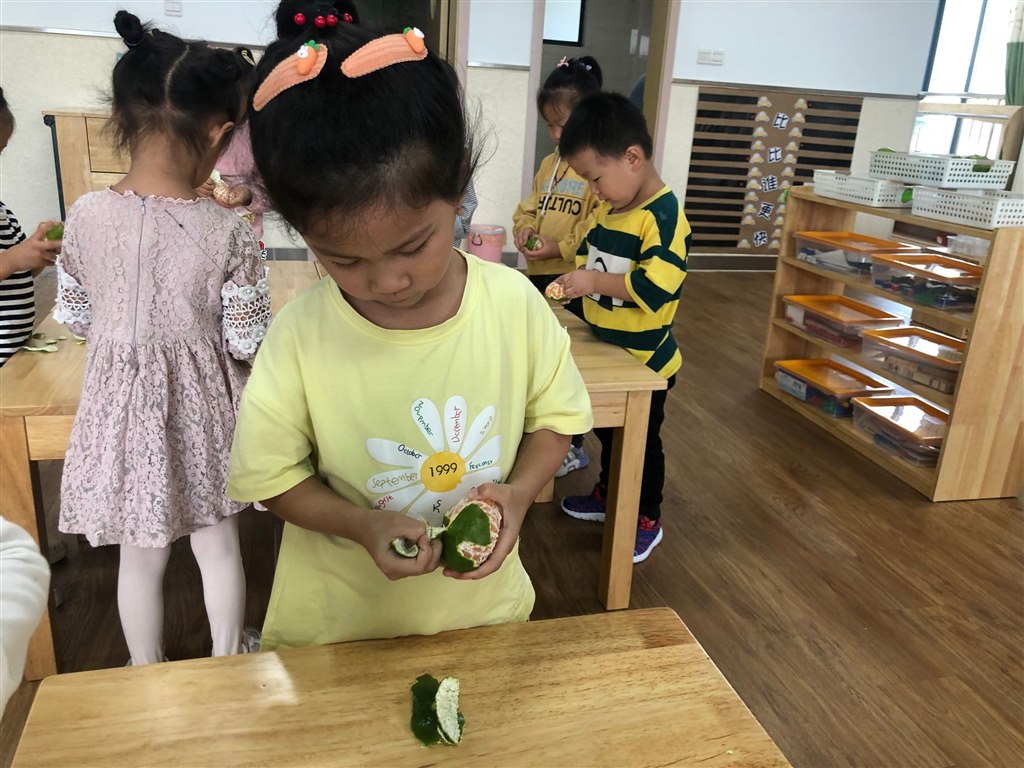 采摘结束后,孩子们团结协作,把一筐筐桔子运回了教室。在看一看、摸一摸、闻一闻、剥一剥、尝一尝、说一说中,了解了桔子的内部结构,品尝到了桔子酸甜的美味,更深刻的了解了水果的营养价值。